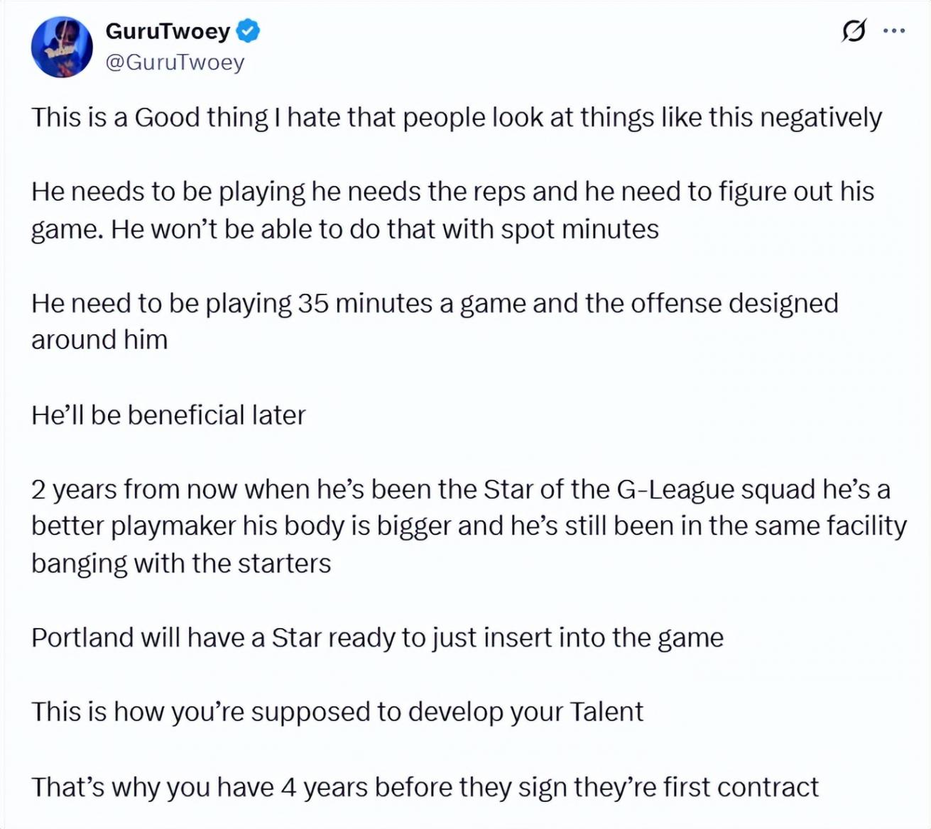 球迷GuruTwoey寫道:“這絕對是件好事,我真不喜歡看到大家把這種事往負面想。他現在就該多打球,需要足夠的出場次數,也得找到適合自己的比賽節奏。零散的出場時間根本做不到這些。他應該每場打35分鐘,球隊還得圍繞他設計進攻戰術。他以后肯定能派上大用場。兩年后,等他成為發展聯盟球隊的核心,傳球能力會更強,身體也會更壯,而且這期間他還能一直在開拓者的訓練館里,和主力球員一起訓練提升。到時候開拓者就能直接擁有一位隨時能上場的球星了。這才是培養新秀該有的方式。不然為什么新秀合同會有4年的時間來用于成長呢?”