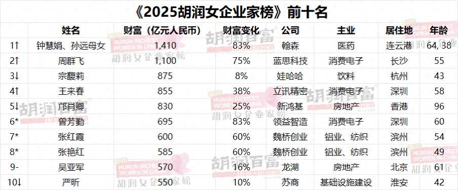 來自中國創新藥頭部企業翰森的鐘慧娟、孫遠母女,以1410億元財富首次成為中國女首富。藍思科技周群飛財富增長470億元,以1100億元位列第二;宗馥莉以875億元排名第三,較去年下降兩位。